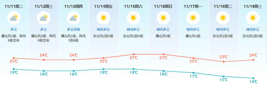 From November 11 to 13, the city will experience mostly cloudy skies with gusts reaching Force 6 and a slight drop in temperatures. Between November 14 and 15, the weather will turn clearer but remain cool, especially in the mornings and evenings. Another round of cold air will arrive between November 16 and 19, bringing more sunshine along with another temperature dip.