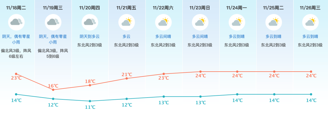 According to the latest forecast, the cold air has already reached the Hunan-Jiangxi area and will affect Dongguan from the night of November 17 to 20. Cloudy skies with occasional light drizzle are expected, along with strong northerly winds reaching gusts of around force 6. Temperatures will fall by 6-8°C, with the lowest dropping to 11-12°C. Daily temperature variation will remain small, and the weather will feel noticeably cold.